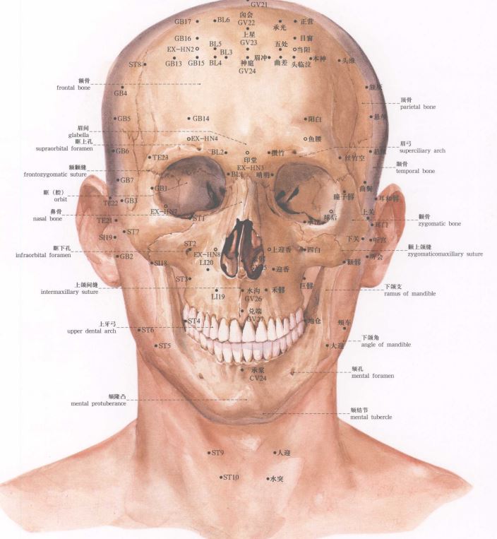 Skeletons and Acupoints on the Head, Face and Neck (Anterior Aspect) 頭面頸部的骨骼與腧穴 (前面)