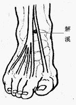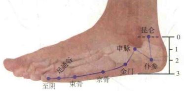 Behind the lateral malleolus of the foot, in the depression between the tip of the lateral malleolus and the Achilles tendon.足部外踝後方,外踝尖與跟腱之間凹陷處。