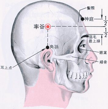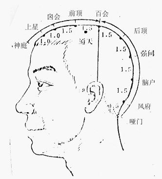 - On the head, 7 inches straight above the middle of the back hairline, at the midpoint of the line connecting the tips of the two ears. 在頭部,當後髮際正中直上7寸,兩耳尖連線的中點處。