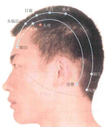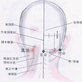 Points: GB-20(Fengchi), BL-10 (Tianzhu), GB-14 (Yangbai), BL-2(Zanzhu).主穴:風池、天柱、陽白、攒竹。
