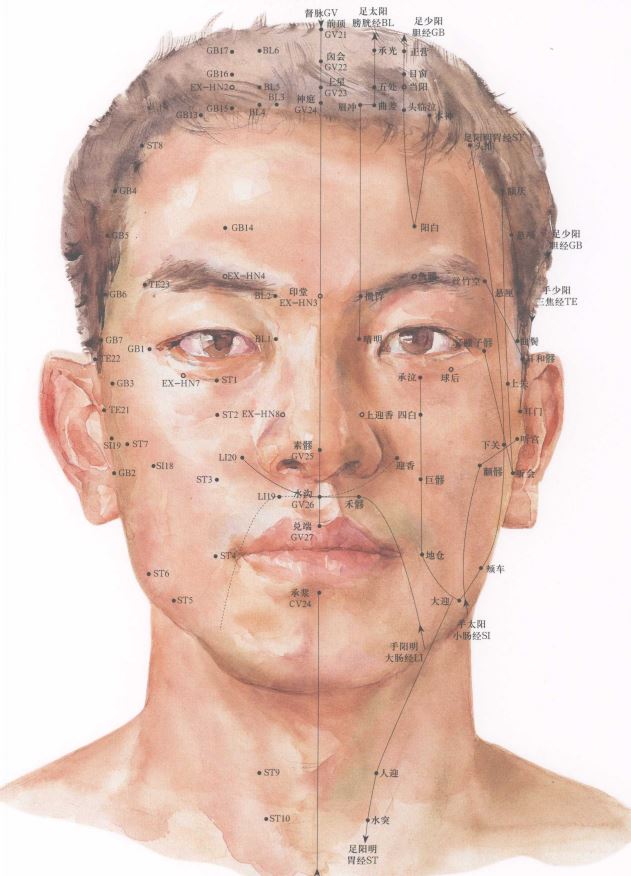 Skin and acupoints on the head, face, and neck (anterior aspect) 頭部頸部的皮膚與腧穴(前面)
