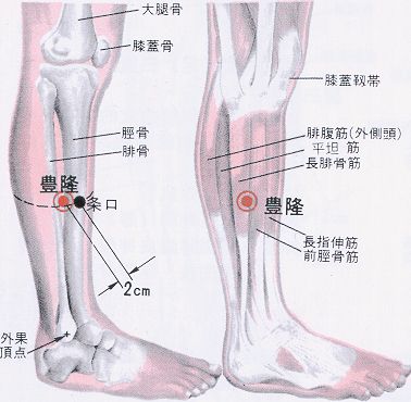 ST-40 (Fenglong) is located at the midpoint of the line connecting the outer knee eye (calf nose) and the outer malleolus tip.豐隆位於外膝眼(犢鼻)與外踝尖連線的中點。