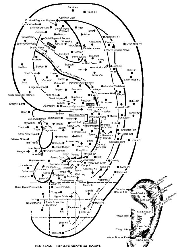 Points: Subcortex, Forehead, Occiput, Kidneys, Pancreas/Gall Bladder and other points of tenderness on the ear. 穴位:皮質下、額頭、枕骨、腎臟、胰臟/膽囊和耳朵上的其他壓痛點