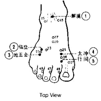 If the headache is associated with Heat in the Stomach or Fire in the Liver and Gall Bladder, add GB-40 (Qiuxu), LIV-3(Taichong), ST-43(Xiangu), ST-8 (Touwei). Symptoms of these conditions include burning fever, severe headache, bloodshot eyes, pain in the ribs, thirst, constipation, vomiting or lumps in the upper abdomen and chest, etc.若頭痛屬胃熱或肝膽火者,加丘墟、太衝、陷谷、頭維。這些病症的症狀包括發燒、嚴重頭痛、眼睛充血、肋骨疼痛、口渴、便秘、嘔吐或上腹部和胸部有腫塊等。