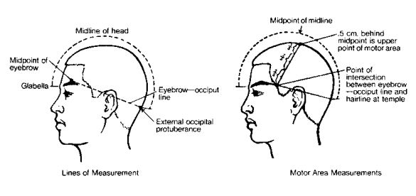 Motor Area: A line starting from a point 0.5 cm posterior to midpoint of midline and stretching diagonally across the head to a point at the intersection of the zygomatic arch (superior margin) with the hairline at the temple.運動區:從中線中點後 0.5 公分處開始,沿對角線穿過頭部,到達顴弓(上緣)與顳部髮際線交點的線。