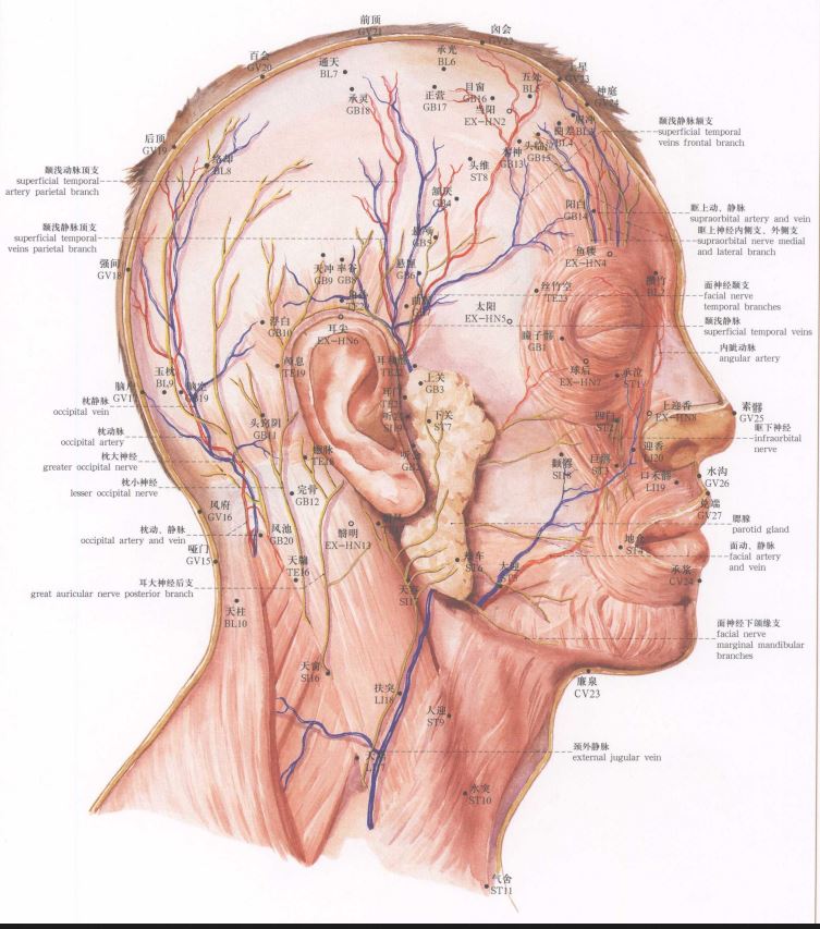 Blood Vessels, Nerves and Acupoints on the Head and Neck (Lateral Aspect) 頭頸部的血管、神經與腧穴(側面)