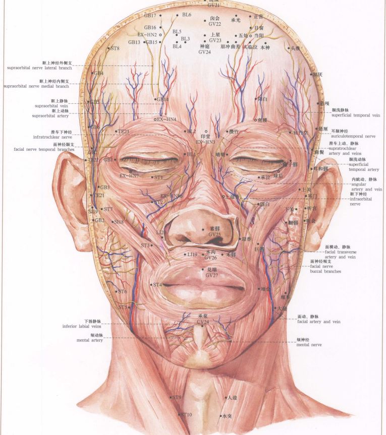 Blood vessels, Nerves and Acupoints on the Head. (anterior aspect) 頭面頸部的血管,神經與腧穴(前面)