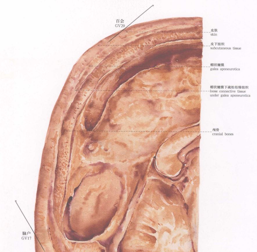 - The hierarchical structure of acupoints is Skin → subcutaneous tissue → galea aponeurosis → loose connective tissue under the galea aponeurosis. It is covered with branches of the greater occipital nerve, frontal nerve, left and right superficial temporal arteries, veins, and occipital arteries and veins anastomosis network. 穴位層次結構依序為皮膚→皮下組織→帽狀腱膜→帽狀腱膜下疏鬆結締組織。布有枕大神經、額神經的分支及左右顳淺動、靜脈及枕動、靜脈吻合網。