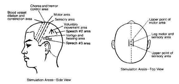 Points: For frontal headache, use the Facial area in the Sensory area on either the affected side, or both sides of the head. For occipital headache, use the Lower limb, head and trunk area in the Sensory area.