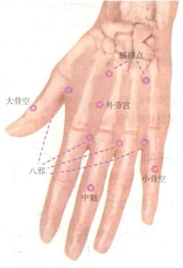 On the back of the hand, between the 2nd and 3rd metacarpal bones and the 4th and 5th metacarpal bones, at the distal end of the transverse crease on the dorsal side of the wrist and the midpoint of the metacarpophalangeal joint。在手背,第2、3掌骨及第4、5掌骨之間,腕背側橫紋遠端與掌指關節中點處。