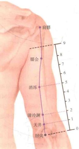 With the elbow flexed, this point can be found approximately 1 unit above the olecranon of the elbow in a slight depression. 手肘屈曲時,在手肘尺骨鷹嘴上約一寸處,稍凹陷處即可找到此穴。