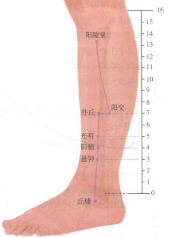 On the outside of the calf, three units above the tip of the lateral malleolus, in the depression on the front edge of the fibula. Or it is located in the depression between the posterior edge of the fibula and the peroneus longus and brevis muscles. 小腿外側部,外踝尖上三寸,腓骨前緣凹陷處。或定于腓骨後緣與腓骨長、短肌之間凹陷處。