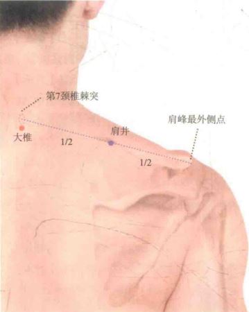 Midway between DU-14 (Dazhui) and the acromion of the shoulder. 大椎與肩峰之間的中點.
