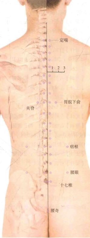 Altogether 48 points distributed on both sides of each of the 24 cervical, thoracic and lumbar vertebrae, 0.5-1 unit lateral to the median line of the spine, at the lower end of the spinous process of each vertebra. 頸、胸、腰24塊椎骨兩側,脊椎正中線旁0.5~1寸,各椎骨棘突下端,共48個穴位。