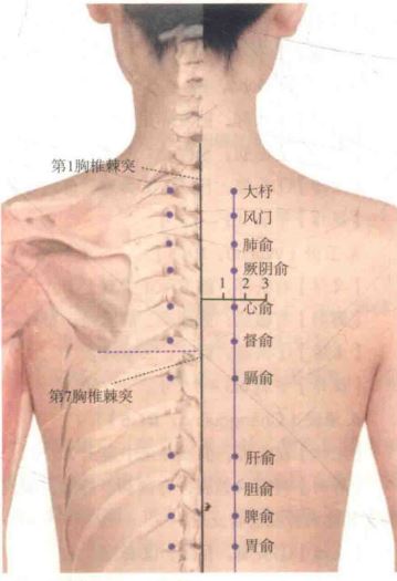 3 units lateral to the bottom of the spinous process of the 1 st thoracic vertebra. 第一胸椎棘突底部外開3寸。