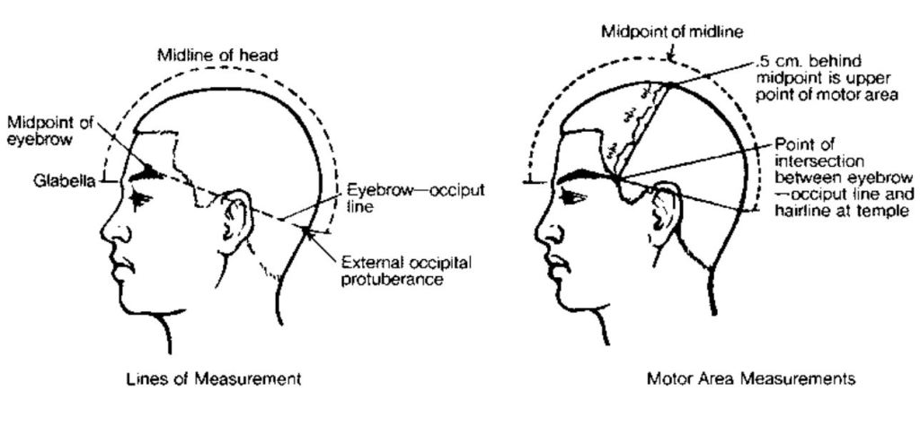 A line starting from a point 0.5 cm posterior to midpoint of midline and stretching diagonally across the head to a point at the intersection of the zygomatic arch (superior margin) with the hairline at the temple. 中線中點後0.5公分處起,沿對角線穿過頭部,至顴弓(上緣)與太陽穴髮際線交點處的一條線。