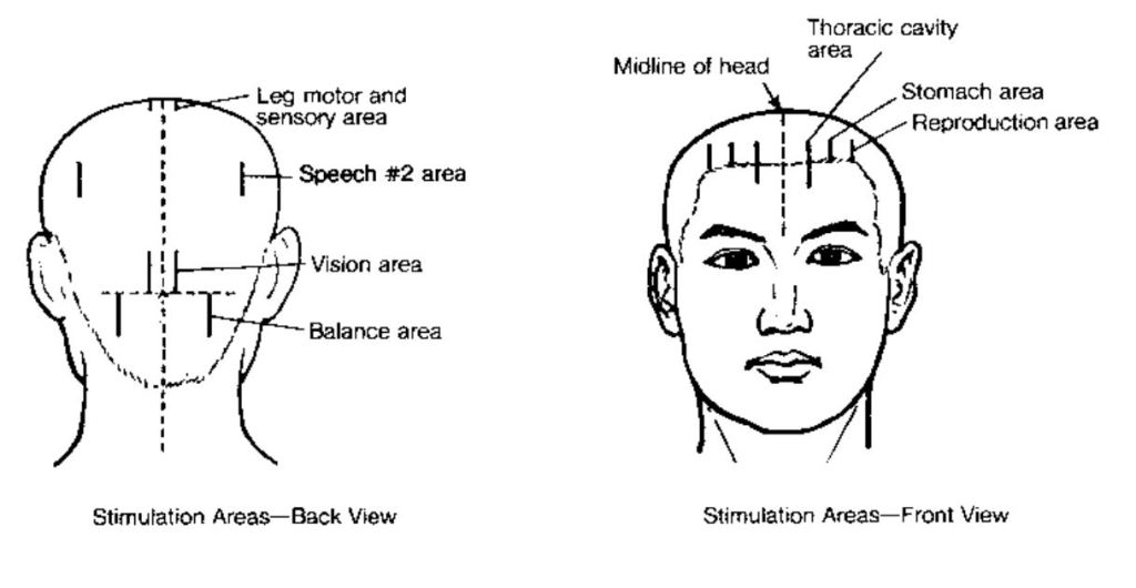 (1) Straight insertion, for needling the nerve root, pointed slightly toward the spine, 1.5 units deep for the cervical and thoracic points, 2.5 units deep for the lumbar points. Sensation: local distension and soreness, or an electric, numb sensation extending to the limbs and between the ribs. 直刺,針刺神經根,略向脊柱方向,頸、胸穴深1.5寸,腰穴深2.5寸。感覺:局部脹痛,或有電擊麻木感,延伸至四肢及肋骨間。