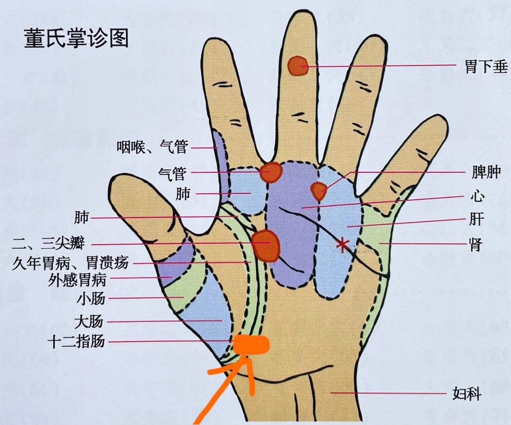 - If there are blue veins or soft flesh on the small intestine meridian on the outer edge of the palm (ulnar side), it is diagnosed as kidney deficiency. 掌外緣(尺側)小腸經上現青筋或肉軟內陷診腎虛。