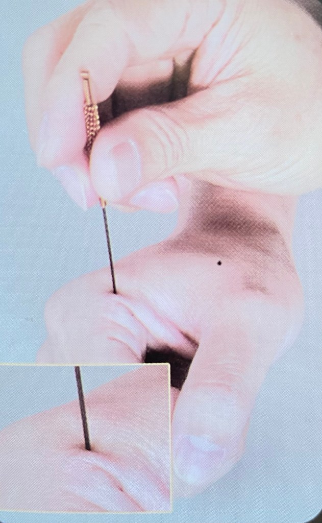Technique: insert a 1.5 to 2-inch needle to the flat palm. If inserting deeply enough, it can reach to the ChongXian point (excessive needle).